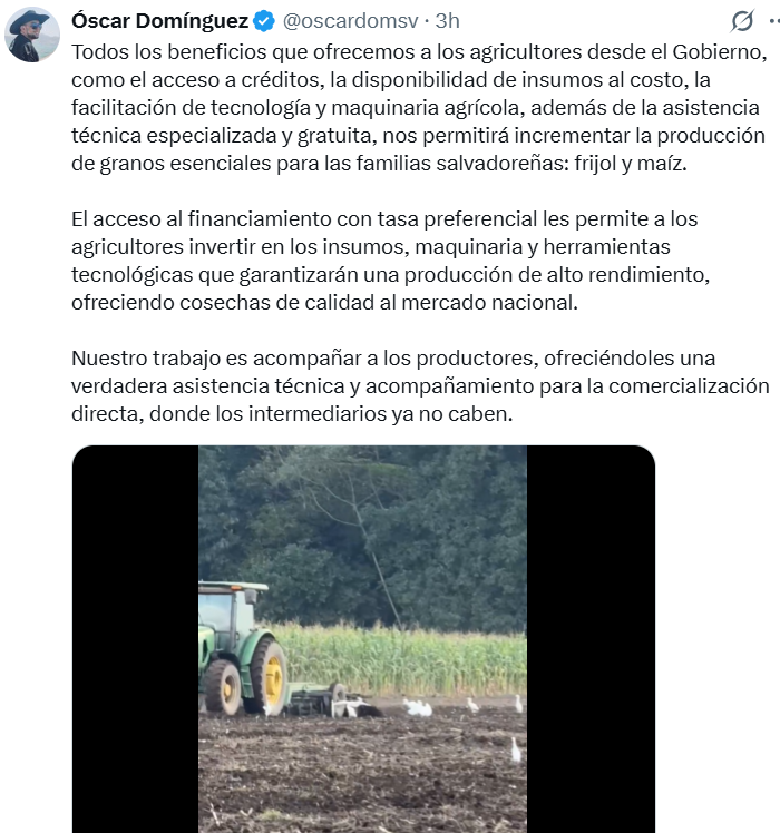 El viceministro de Agricultura de El Salvador, Óscar Domínguez, destacó a través de sus plataformas oficiales el conjunto de medidas que el Gobierno salvadoreño está impulsando para fortalecer la productividad agrícola, particularmente en los cultivos de frijol y maíz, considerados pilares de la seguridad alimentaria en la nación centroamericana.