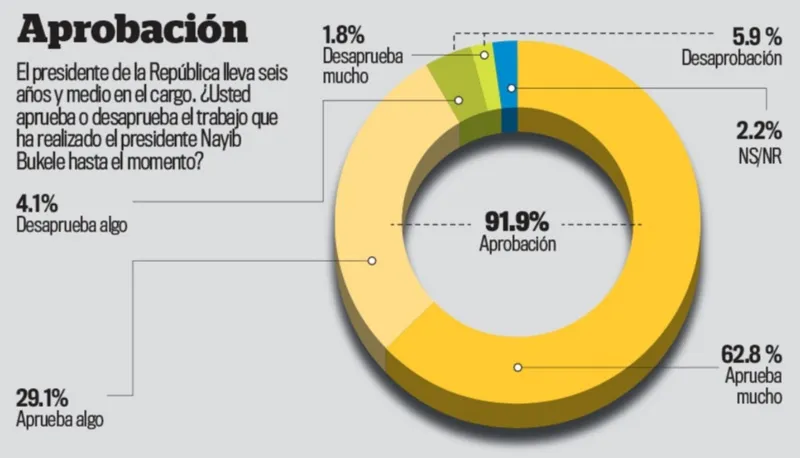 El sondeo muestra que un 62,8 % respalda a Bukele con un alto grado de aprobación, mientras que un 29,1 % lo aprueba de manera moderada. Solo un 5,9 % desaprueba y un 2,2 % no se pronunció. Entre los motivos de satisfacción, la percepción de mejoras en seguridad lidera con 33 %, seguida de cambios positivos en distintas áreas (14,3 %) y un desempeño general favorable (11 %).